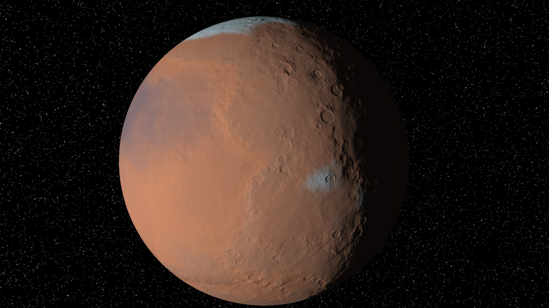 In the lowlands, dark blue basalt volcanic rock beneath the dust.